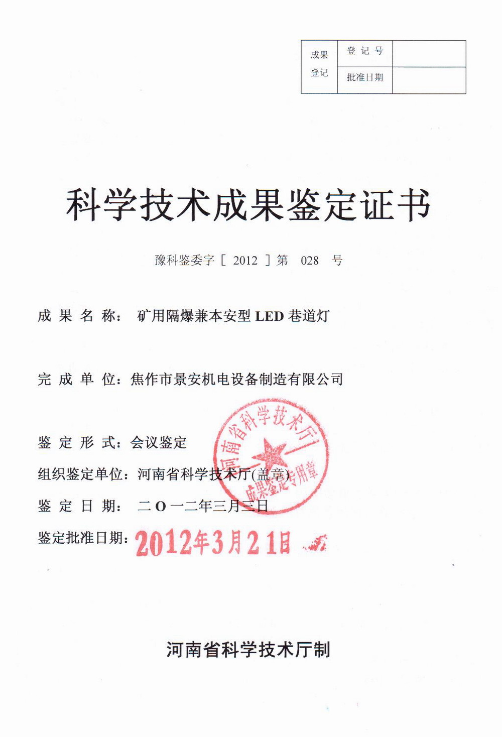 2012年3月21日,我公司研制開(kāi)發(fā)的“礦用隔爆兼本安型LED巷道燈”項(xiàng)目通過(guò)河南省科技廳組織的科技成果鑒定,鑒定委員會(huì)一致認(rèn)為:本項(xiàng)目達(dá)到同類產(chǎn)品國(guó)內(nèi)領(lǐng)先水平。該項(xiàng)目采用本質(zhì)安全電源技術(shù),設(shè)計(jì)了本質(zhì)安全型疊加恒流源電源,使燈具運(yùn)行穩(wěn)定、安全、可靠;采用防靜電技術(shù)設(shè)計(jì)了光學(xué)透明罩和防塵罩;進(jìn)行了合理的結(jié)構(gòu)設(shè)計(jì),金屬防護(hù)外殼為LED光源散熱,保證燈具連續(xù)使用下微光衰,長(zhǎng)壽命,并且具有良好的防塵、防水、防腐性能。